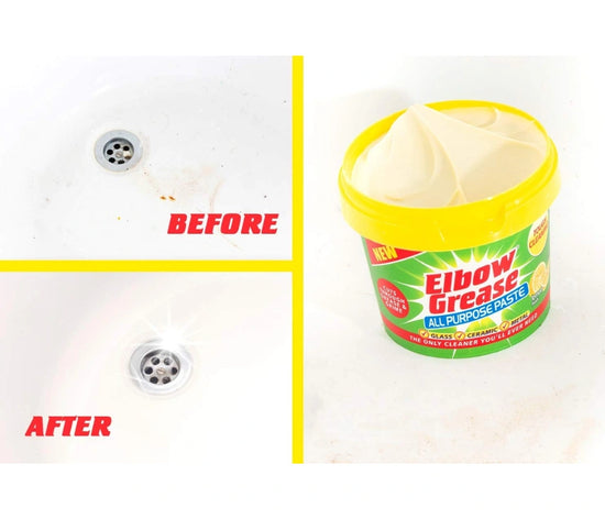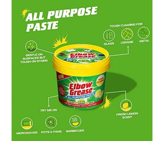 Keep your home sparkling clean with this All Purpose Paste, the miracle product from Elbow Grease. This powerful cleaning paste is ideal for removing tough and stubborn stains from the surfaces such as kitchen and bathroom sinks, cooker tops, baking trays, barbecues, grills, ovens, tiles, furniture and more. It quickly and efficiently removes the toughest of stains, dirt, discoloration and rust from ceramic, wood and metal surfaces.