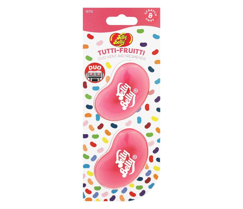 Enjoy a refreshing fragrance in your car with the Jelly Belly Tutti Fruitti Mini Vent 3D Gel Duo Pack Air Freshener. This set includes two vent-mounted gel air fresheners, designed to provide a long-lasting, delightful Tutti Fruitti scent.