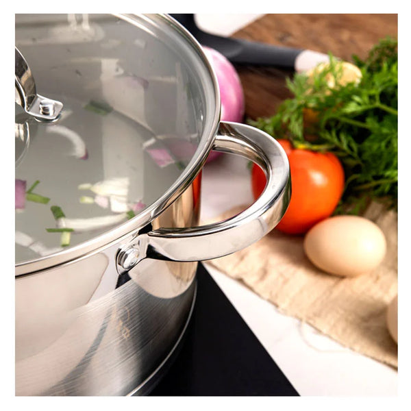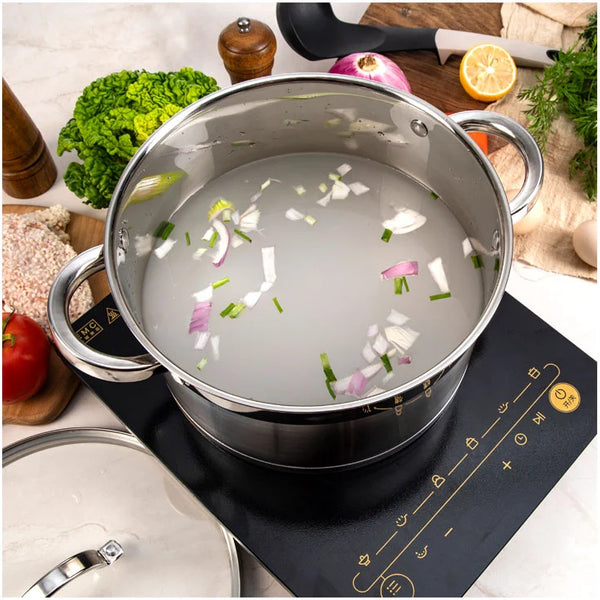 This 12-piece stainless steel cookware set is designed to make cooking easy and enjoyable. Featuring 4 casserole pots, a saucepan, and a deep-frying pan, each with tempered glass lids, this set is perfect for preparing a variety of dishes, from hearty casseroles to quick stir-fries. The set is compatible with all stove types, including induction, and features stainless steel handles for a secure grip.